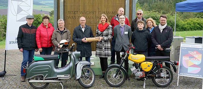 Im Gepäck hatte das Organisationsteam der Gesellschaft zur Erforschung der Demokratie-Geschichte (GEDG) um Dr. Christian Faludi einen Staffelstab. Darin enthalten eine 1,60 Meter lange Schriftrolle. Darauf bekannten sich mit ihrer Unterschrift Manuela Henkel (Bürgermeisterin der Point-Alpha-Stadt Geisa), Jürgen Hahn (Bürgermeister der Point-Alpha Gemeinde Rasdorf) und Philipp Metzler (Vorstand der Point Alpha Stiftung) stellvertretend für die Region zur Demokratie und für den Erhalt der freiheitlichen Werte der Verfassung. Die Urkunde wird am 25. Mai beim Bürgerfest in Bonn an Bundespräsident Frank-Walter Steinmeier übergeben. Danach wird diese in der Villa Hammerschmidt in Berlin ausgestellt. Zu den Unterzeichnern gehörte auch der 15-jährige Moritz Krüger aus Geisa, der zuvor mit dem 59-jährigen Marcel Wächtersbach auf einem alten Simson-Motorrad symbolisch für die Generationen den Tour-Staffelstab entlang der ehemaligen Grenzsperranlagen am Kolonnenweg vom Haus auf der Grenze zum US Camp transportiert hatte.