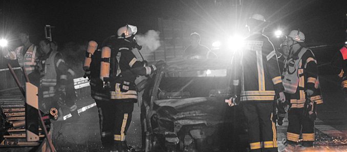 Gemünden. Ein Auto ist in der Nacht zum Donnerstag auf der A5 bei Gemünden (Felda) in Brand geraten. Laut Polizeiangaben fing das Fahrzeug auf dem Weg in Richtung Kassel vermutlich durch einen technischen Defekt Feuer. Der 28-jährige Fahrer aus Grünberg konnte sich unverletzt in Sicherheit bringen. Bei Eintreffen der Feuerwehr aus Nieder-Ohmen brannte das Fahrzeug in voller Ausdehnung. Laut Feuerwehrangaben wurden die Flammen mit mehreren Strahlrohren bekämpft, dazu waren rund zwanzig Feuerwehrleute mit fünf Einsatzfahrzeugen vor Ort. „Bedingt durch die anhaltende Trockenheit waren auch schon etwa 80 Quadratmeter Böschung in Brand geraten“, so die Gemeindebrandinspektoren Martin Schlosser und Bernd Wißner. Für die Löscharbeiten musste die Autobahn zeitweise voll gesperrt werden. Den entstandenen Sachschaden bezifferte die Polizeiautobahnstation Bad Hersfeld auf etwa 6.000 Euro. ++ pw