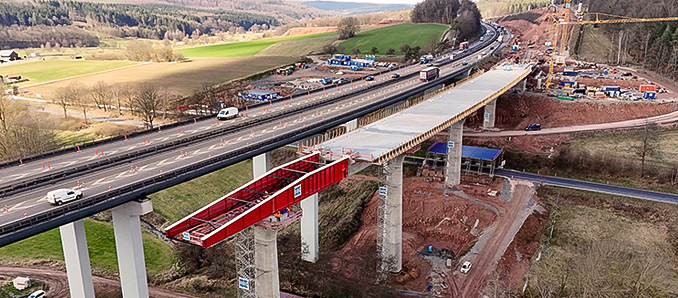 Der Brückenüberbau der Talbrücke Thalaubach, im Zuge der A7 bei Eichenzell-Döllbach, schiebt sich in 5 Stunden 25 Meter über das Tal. Der Überbau wird im sogenannten Taktschiebeverfahren hergestellt. Dazu wird das Bauteil abschnittsweise in einzelnen „Takten“ im sogenannten „Taktkeller“ gebaut. Der Taktkeller befindet sich auf der nördlichen Seite des Tals. Die miteinander verbundenen Takte werden von dort aus per hydraulischer Schubeinrichtung in 38 Meter Höhe über das Tal und die vorab neu hergestellten Brückenpfeiler geschoben.
