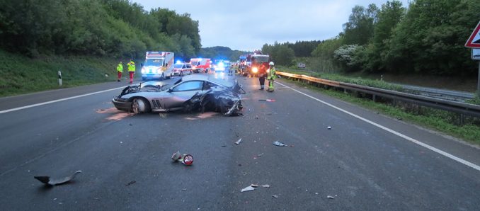 Kassel. Am Sonntagmorgen verunglückte ein 33-Jähriger aus Niestetal mit seinem Ferrari auf der Autobahn A7. Er war gegen 04:50 Uhr mit seinem Ferrari 550 Maranello auf der A7 zwischen den Anschlussstellen Hann. Münden/Lutterberg und Kassel-Nord in Fahrtrichtung Süden unterwegs. Aufgrund überhöhter Geschwindigkeit zunächst nach rechts von der Fahrbahn ab, schleuderte anschließend wieder zurück auf die Fahrbahn und kam nach etwa 200 Metern auf dem mittleren Fahrstreifen zum Stehen.