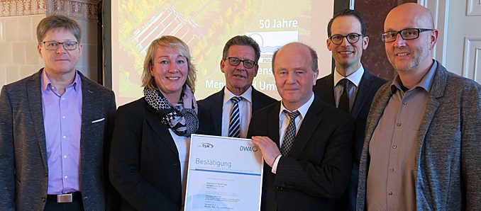Der DWA-Landesverbandsvorsitzende, Dipl.-Ing. Peter Lubenau, händigte dem Geschäftsführer des Verbandes, Dipl.-Ing. Joachim Adams, als technischer Führungskraft das TSM-Zertifikat aus. Dieses Qualitätssiegel bescheinigt dem Abwasserverband die sichere, wirtschaftliche und umweltfreundliche Abwasserentsorgung. Dazu musste sich der Verband im August 2017 einer 2-tägigen freiwilligen Überprüfung durch ein unabhängiges DWA-Expertenteam stellen. Geprüft wurden die Fachkompetenz der Mitarbeiterinnen und Mitarbeiter und die organisatorischen Strukturen des Verbandes. Die DWA-Experten kontrollierten zudem den technischen Zustand der Anlagen, das Störungsmanagement und die Beachtung der Sicherheitsbestimmungen. Daniel Schreiner und Joachim Adams zeigten sich über diese Bestätigung sehr erfreut und bedanken sich insbesondere bei den Mitarbeiterinnen und Mitarbeitern des Verbandes, die das TSM täglich mit Inhalt füllen und damit der wesentlichste Bestandteil der Organisationsstruktur sind.