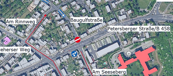 Verkehrsteilnehmer, die aus Richtung Innenstadt kommen und in das Viertel einfahren wollen, müssen daher zukünftig einen kleinen Umweg in Kauf nehmen und statt des Linksabbiegens mehrfach rechts abbiegen und dabei folgenden Fahrweg nehmen (vgl. Abbildung): Von der Petersberger Straße nach rechts in die Straße „Am Seeseberg“, dann nach rechts in die Straße „Am Jagdstein“, dann an der Kreuzung wieder nach rechts in die Straße „Am Kleegarten“, danach geradeaus über die große Kreuzung mit der B458 in den Zieherser Weg und schließlich wieder nach rechts über die Straße „Am Rinnweg“ in die Baugulfstraße, die künftig in dem oberen Teilbereich durch die gedrehte Einbahnstraßenregelung aus Richtung Rinnweg angefahren werden kann. Im unteren Abschnitt der Baugulfstraße Richtung Wasserturm bleibt die bisherigen Einbahnstraßenregelung gültig. Die Maßnahme wird voraussichtlich am Dienstag, 17. Januar 2023, nach dem morgendlichen Berufsverkehr umgesetzt werden. +++ pm