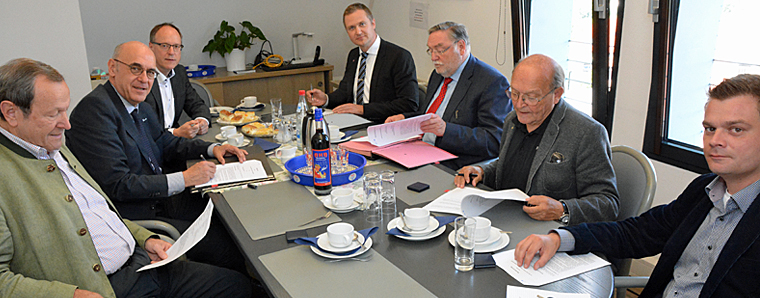 Unterzeichneten die neuen Aha Verträge, Wendelin Priller, Bürgermeister Stefan Schwenk, Stadtwerke Geschäftsführer Stefan Schubert, Geschäftsführer der Schlitzer Destillerie, Tobias Wiedelbach, der Schlitzer Bürgermeister und Aufsichtsratvorsitzender der Destillerie, Hans-Jürgen Schäfer, der bisherige Geschäftsführer der Aha Likör GmbH, Siegfried Henle und Jan Drinnenberg von der Firma Heurich.