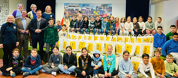 Das Bild zeigt die Schülerinnen und Schüler aus den Klassen 2b und 4c der Bergwinkel-Grundschule in Schlüchtern mit (mittlere Reihe von links) Schulleiterin Iris Müller, Landrat Thorsten Stolz und Bürgermeister Matthias Möller sowie (hintere Reihe von links): Dr. Gunda Adolphi (Geschäftsführerin des Arbeitskreises Jugendzahnpflege und Sachgebietsleiterin des Zahnärztlichen Dienstes), Maria Bilz (Arbeitskreis Jugendzahnpflege) und Konrektorin Anja Rummel.