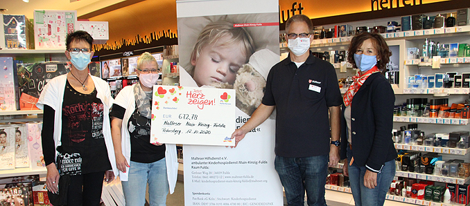 Sandra Bönisch und Daniela Keppler vom dm-Drogeriemarkt Alte Ziegelei in Petersberg sind beeindruckt vom großen sozialen Engagement der Mitarbeitenden im ambulanten Malteser Hospizdienst Main-Kinzig-Fulda. Im Rahmen der Aktion „Jetzt Herz zeigen“ spendete die Drogeriefiliale mit 672,78 Euro fünf Prozent eines Tagesumsatzes im September an die Organisation, die sich in der Region um lebensbedrohlich Erkrankte, Kinder wie Erwachsene, kümmert.