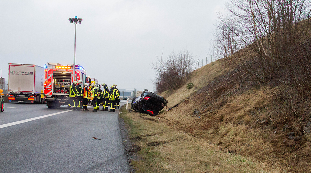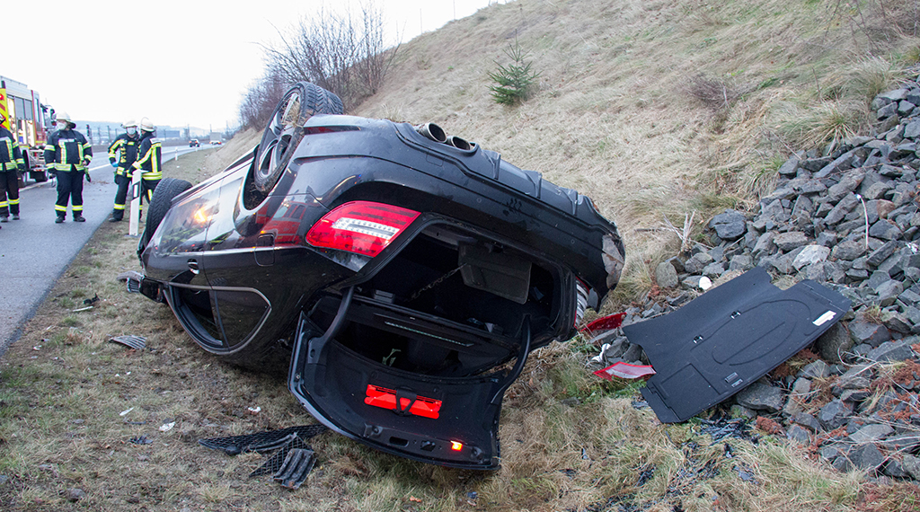 Auf der A66 ereignete sich am Montag gegen 15.35 Uhr, zwischen den Anschlussstellen Neuhof-Süd und Neuhof-Nord, ein Alleinunfall mit einer verletzten Person. Der 46-jährige Pkw-Fahrer aus dem Landkreis Rhön-Grabfeld befuhr den rechten der beiden Fahrstreifen. Als er den Tunnel Neuhof passiert hatte, beschleunigte er nach derzeitigen Erkenntnissen mit seinem Mercedes-Benz und geriet auf feuchter Fahrbahn ins Schleudern. Der 46-Jährige verlor die Kontrolle über das Fahrzeug, kam nach rechts von der Fahrbahn ab, fuhr in die Böschung, überschlug sich und blieb auf dem Fahrzeugdach liegen. Der Fahrer konnte sich aus dem Fahrzeug befreien und wurde durch zwei zufällig vor Ort anwesende Sanitäter medizinisch betreut. Glücklicherweise wurde er nur leicht verletzt, musste jedoch zur weiteren medizinischen Behandlung ins Krankenhaus verbracht werden. Der Sachschaden beläuft sich auf rund 20.000 Euro. Der rechte Fahrstreifen war für circa 90 Minuten gesperrt. Aufgrund des geringen Verkehrsaufkommens kam es zu keinen nennenswerten Beeinträchtigungen. Im Einsatz waren der Rettungshubschrauber Christoph 28 sowie die Feuerwehr Neuhof. +++