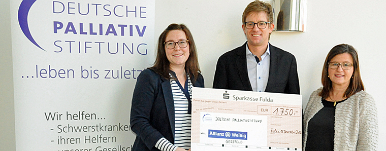 Fulda. Anstatt ihren Kunden zu Weihnachten Geschenke zukommen zu lassen, spendet das Allianz Versicherungsbüro Weinig aus dem osthessischen Gersfeld (Rhön), im Landkreis Fulda, alljährlich an eine gemeinnützige Organisation. Dieses Jahr unterstützt das Versicherungsbüro die Arbeit der Deutschen PalliativStiftung. Kunden des Versicherungsbüros haben sich der Zuwendung angeschlossen, sodass eine beachtliche Summe in Höhe von insgesamt 1.750 Euro zusammengekommen ist. Den Spendenscheck an die Deutsche PalliativStiftung überreichte am 15. Dezember 2016 Michael Weinig vom gleichnamigen Allianz Versicherungsbüro an die stellvertretende Vorstandsvorsitzende der Deutschen PalliativStiftung am Standort Fulda Elke Hohmann sowie an die Geschäftsstellenleiterin Mara Kübel. +++ (pm/ja)