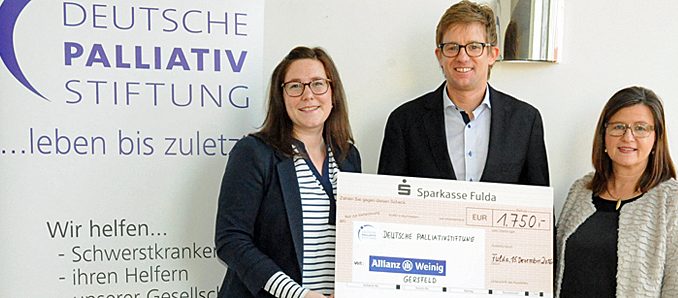 Fulda. Anstatt ihren Kunden zu Weihnachten Geschenke zukommen zu lassen, spendet das Allianz Versicherungsbüro Weinig aus dem osthessischen Gersfeld (Rhön), im Landkreis Fulda, alljährlich an eine gemeinnützige Organisation. Dieses Jahr unterstützt das Versicherungsbüro die Arbeit der Deutschen PalliativStiftung. Kunden des Versicherungsbüros haben sich der Zuwendung angeschlossen, sodass eine beachtliche Summe in Höhe von insgesamt 1.750 Euro zusammengekommen ist. Den Spendenscheck an die Deutsche PalliativStiftung überreichte am 15. Dezember 2016 Michael Weinig vom gleichnamigen Allianz Versicherungsbüro an die stellvertretende Vorstandsvorsitzende der Deutschen PalliativStiftung am Standort Fulda Elke Hohmann sowie an die Geschäftsstellenleiterin Mara Kübel. +++ (pm/ja)