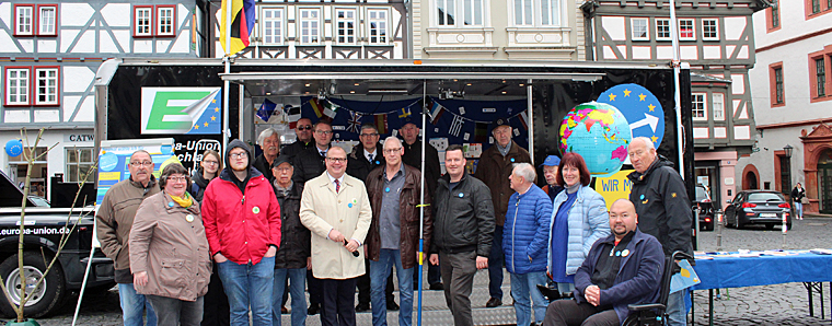 Auf dem Alsfelder Marktplatz warb die Europa-Union Vogelsbergkreis für die Europäische Union. Am 26. Mai wird ein neues EU-Parlament gewählt. Die Europa-Union Vogelsbergkreis wirbt mit verschiedenen Veranstaltungen für die Europäische Union. Am Donnerstag, 04. April suchten Landrat Manfred Görig, Bürgermeister Stephan Paule und die Kreisvorsitzende der Europa-Union Schwalm-Eder, Marianne Hühn, Kontakt mit den Bürger*innen, um unter anderem über EU-Mythen aufzuklären und Fragen zu beantworten.