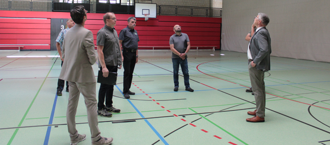 „Die alten Leuchtstoffröhren haben die Felder der Halle unterschiedlich intensiv beleuchtet“, schildert der Planer. Deshalb werden sie durch moderne LED-Flächenstrahler ersetzt. „Alles ist mit dem Sportbund abgestimmt“, so Schneider. Gemeinsam mit Horst Löffler, Geschäftsführer der ESAtec GmbH aus Wartenberg zählt er auf, welche Arbeiten in den nächsten Wochen in der Halle ausgeführt werden: So werden Beleuchtungskörper, Gebäudehauptverteilung und Unterverteilungen der 1980/81 gebauten Halle jetzt ausgetauscht. Parallel erfolgt die Erneuerung der defekten Sicherheitsbeleuchtung, der Uhrenanlage, der Spielfeldanzeige und der Medientechnik. Außerdem gibt es Anpassungen beim inneren Blitzschutz und dem technischen Brandschutz. Wobei: Die Brandmeldeanlage selbst ist bereits „auf dem neuesten Stand“, wie Landrat Manfred Görig betont. Moderne, sicherheitstechnische Einrichtungen wie Fehlerstromschutzschalter und Sprachalarmierungsanlagen müssen den Vorgaben der Versammlungsstättenrichtlinie angepasst und nachgerüstet werden, sagt Diplom-Ingenieur Stefan Schmidt von Amt für Hochbau, Energie und Gebäudewirtschaft. Er weist zudem darauf hin, dass die Arbeiten aufgrund des Umfangs durch ein nach öffentlicher Ausschreibung beauftragtes Planungsbüro geplant werden, das jetzt auch die Umsetzung begleiten und überwachen wird.