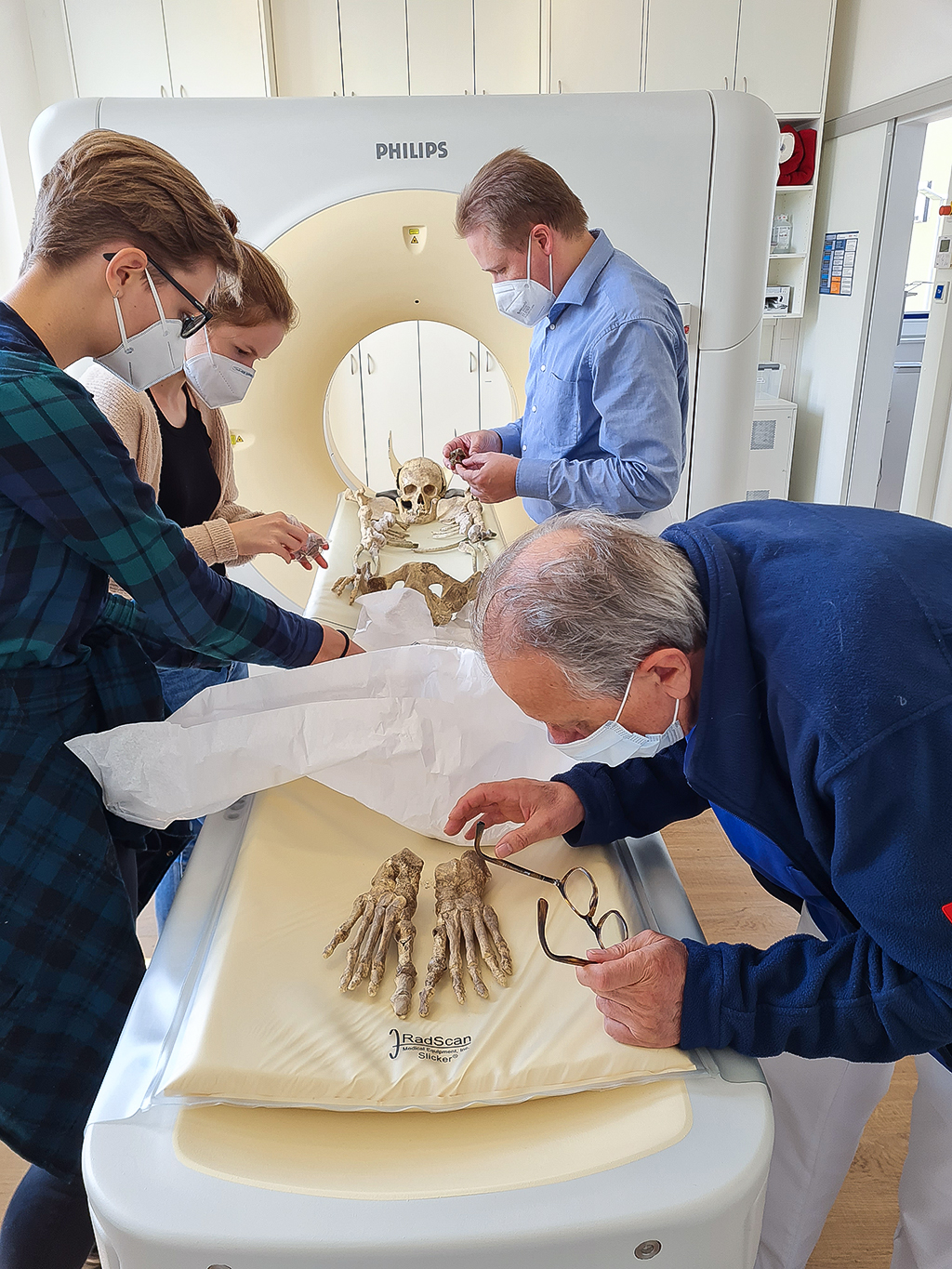 Eine kleine Sensation kam zutage, als die Knochen des berühmten „Mädchen von Molzbach“ in der radiologischen Praxis untersucht wurden. Die Knochen waren 1931 bei Molzbach gefunden worden und stammen aus der Bronzezeit. Der Fundort gilt als reichstes Mädchengrab in Hessen. „Nur handelt es sich gar nicht um ein Mädchen“, führte Zilles aus. Anhand der Ausbildung der Weisheitszähne könne man genau nachweisen, wie alt die Person bei ihrem Tod war: 21,8 Jahre. „Das ‚Mädchen von Molzbach‘ ist also eher eine junge Frau. Wir sind die ersten, die das erkannt haben“, betonte der Mediziner. Wingenfeld fügte an: „Die früheren Theorien, die von einem Alter zwischen 12 und 15 Jahren ausgehen, sind damit widerlegt.“