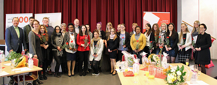 Das Gruppenfoto der Absolventen und ihrer Gratulanten entstand im Rahmen der Zeugnisfeier in der Aula des Caritas-Hauses St. Elisabeth in der Ratgarstraße, wo auch die Schule ihren Standort hat.