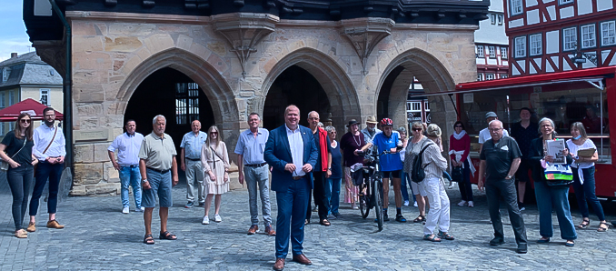 Von der Obergasse aus verlief der Rundgang über Schaufußgasse, Marktplatz, Mainzer Gasse, Mainzer Tor, Roßmarkt, Am Kreuz, Steinborngasse, Untergasse, Hersfelder Straße und Kaplaneigasse. Halt gemacht wurde an Gebäuden, deren Instandsetzung bereits über das Förderprogramm Lebendige Zentren, oder über andere Förderprogramme der Stadt gefördert wird, oder werden soll.