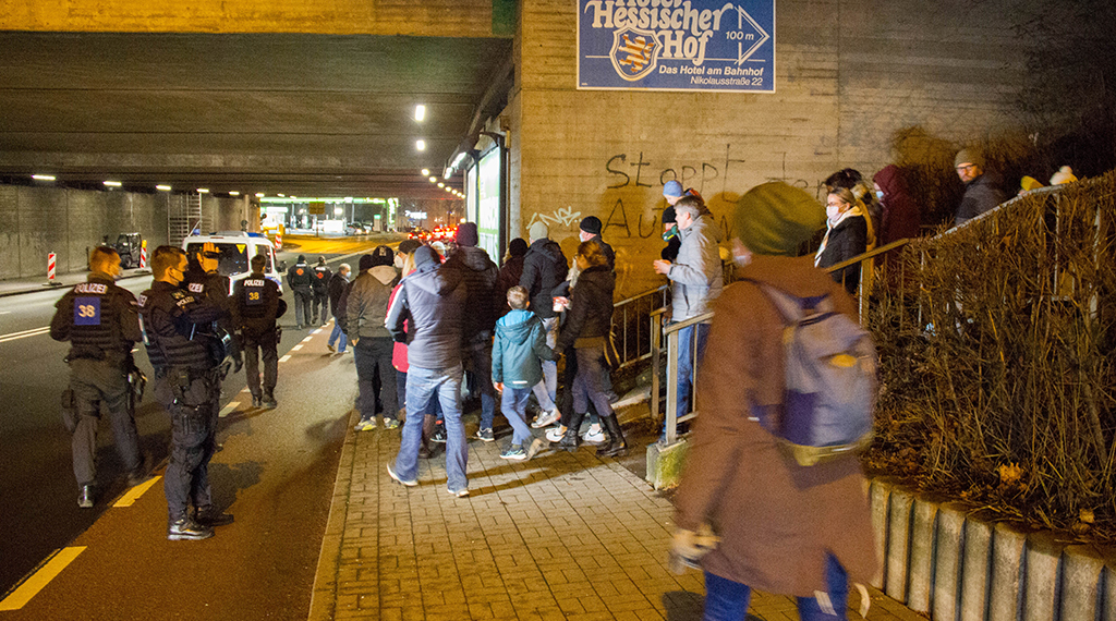 Auch in Fulda versammelten sich gegen 18 Uhr mehrere hundert Personen im Bereich des Parkplatzes Ochsenwiese und zogen fußläufig in Gruppen durch die Innenstadt. Trotz mehrfacher und wiederholter Bekanntgabe des Versammlungsstatus und der erlassenen Auflagenverfügung der Versammlungsbehörde der Stadt Fulda über Lautsprecherdurchsagen der Polizei, hielt sich ein Großteil der Teilnehmenden nicht an die Auflagen. Nach rund einer Stunde löste sich die nicht angemeldete Versammlung auf und die Teilnehmenden entfernten sich aus dem Innenstadtbereich.