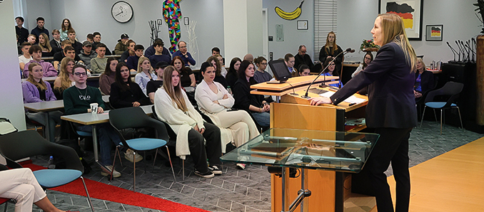 Unter der Überschrift ihrer 30-minütigen Impulsvortrages „Am Puls der Zeit: Hessens Herzkammer der Demokratie in politisch bewegten Zeiten“ verdeutlichte die Repräsentantin des höchsten hessischen Verfassungsorgans, für was sie eintritt, warnte im Zeitalter zunehmender Digitalisierung aber auch vor KI-generierten Fake News als Gefahr für unsere Demokratie. Ferner ließ die Parlamentspräsidentin die Heranwachsenden an ihrem Leben als Privatperson teilhaben, dass als Person des öffentlichen Lebens auch viel Entbehrung und Verzicht bedeutet.