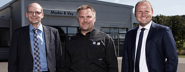 Der Betriebsleiter der beiden Autohäuser Andreas Wätjen, der bisherige Inhaber des Autohaus Mader & Vey und gleichzeitig neuer Filialleiter, Stefan Vey, mit Philipp Atzert Geschäftsführer der atzert:weber Holding vor dem Autohaus Mader & Vey