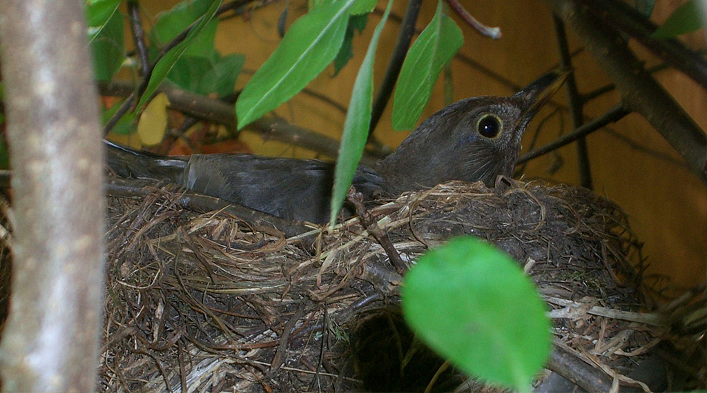 Schon nach einer Woche, als die ersten Jungen ausgeflogen waren, hat das Amselweibchen mit dem Bebrüten des zweiten Geleges begonnen.