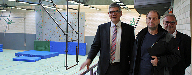 Das nennt man wohl eine Punktlandung: Im April – zum Start der umfangreichen Bauarbeiten – wurde angekündigt, dass die Alsfelder Großsporthalle nach den Herbstferien wieder für den Schulsport zur Verfügung steht. Am Montag geht es wieder in die Schule – und: Die Halle ist fertig! „Wir haben hier richtig gute Arbeit geleistet“, unterstreicht Landrat Manfred Görig bei einem Besuch vor Ort am Freitagmorgen. Und auch Peter Schwärzel, der Leiter des Amtes für Schulen und Liegenschaften, sowie sein Mitarbeiter Jens Salzmann pflichten ihm bei: „Alles hat hervorragend geklappt, wir sind pünktlich fertig geworden.“