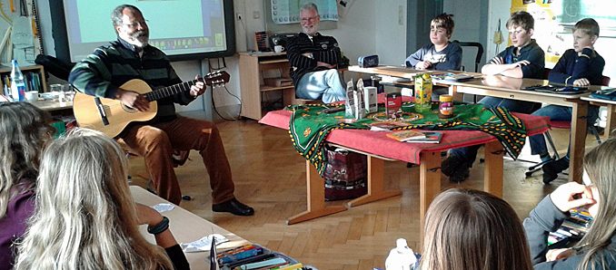 Jean-Félix Belinga Belinga sprach mit den Kindern auch über die Missstände in seiner Heimat. Zum Beispiel darüber, dass dort auf den Kakaoplantagen Kinderarbeit stattfindet. Mit Berichten aus seinem Leben in Kamerun vermittelte er in kindgerechter Form Informationen zum Aufwachsen, Leben und Arbeiten in Afrika sowie zum fairen Warenumschlag.