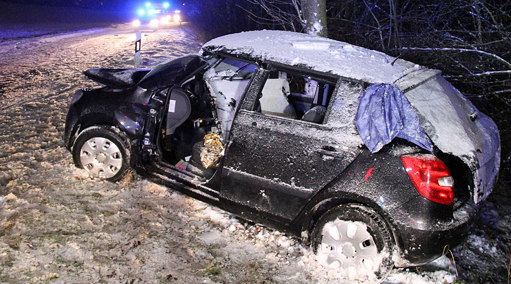 Hünfeld. Am Sonntagnachmittag kam gegen 16:45 Uhr eine 42-jährige aus einem Hünfelder Stadtteil auf schneeglatter Fahrbahn – mit ihrem Skoda – aus bisher ungeklärter Ursache auf der Kreisstraße 122 zwischen Großenbach und Hünfeld nach rechts von der Fahrbahn ab und schleuderte gegen einen Baum. Die Fahrzeugführerin wurde in ihrem Fahrzeug eingeklemmt und ihre drei Insassen konnten sich selbstständig aus dem Wagen befreien. Die Fahrzeugführerin wurde schwer, aber nicht lebensbedrohlich verletzt. Die Mitfahrer wurden zwecks vorsorglicher Untersuchung eben ins Krankenhaus verbracht. Am Fahrzeug entstand wirtschaftlicher Totalschaden in geschätzter Höhe von 7000 Euro. Im Einsatz waren Feuerwehren aus Hünfeld und mehrere Krankenwagen. +++