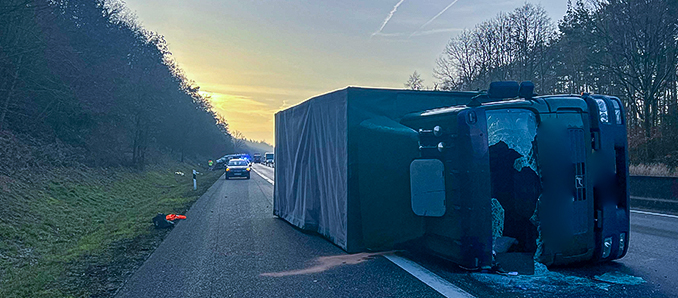 Am Donnerstagmorgen kam es auf der A7 zwischen den Anschlussstellen Hünfeld/Schlitz und Niederaula zu einem Auffahrunfall. Nach derzeit vorliegenden Erkenntnissen befuhren ein 67-jähriger Mann aus dem Landkreis Darmstadt-Dieburg mit einem Lkw sowie ein 37-jähriger Mann mit seinem 30-jährigen Mitfahrer in einem Sprinter - beide aus Künzell - die rechte Fahrbahn in ebendieser Reihenfolge. Aus noch unklarer Ursache fuhr der 37-Jährige plötzlich auf das Heck des vorausfahrenden Sattelzugs auf. Dieser geriet hierdurch zunächst nach rechts in den angrenzenden Grünstreifen und kippte schließlich auf der Fahrbahn auf die rechte Fahrzeugseite um. Auch der Sprinter fuhr nach der Kollision in den Grünstreifen und kam dort querstehend zum Stillstand. Alle drei Fahrzeuginsassen wurden leicht verletzt und zur weiteren medizinischen Versorgung in Krankenhäuser verbracht. Durch herumfliegende Fahrzeugteile wurde darüber hinaus ein weiterer Lkw beschädigt. An allen drei Fahrzeugen entstand ersten Schätzungen zufolge Gesamtsachschaden von circa 28.000 Euro. Im Rahmen der Bergungs- und Abschlepparbeiten musste die Autobahn vorübergehend vollgesperrt werden. Mittlerweile ist die linke Fahrspur wieder freigegeben. +++