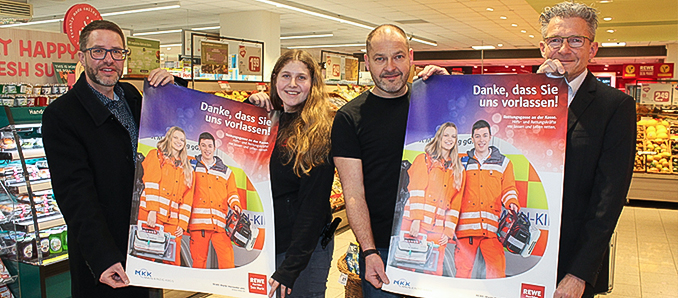 Sichtbare Wertschätzung für Einsatzkräfte: Der Rewe-Markt um die stellvertretende Marktleiterin Madline Köbert und Geschäftsführer Jürgen Herröder (Mitte) werben gemeinsam mit Landrat Thorsten Stolz (links) und Dr. Wolfgang Lenz (Leiter des Amts für Gesundheit und Gefahrenabwehr) für die „Rettungsgasse an der Kasse“.