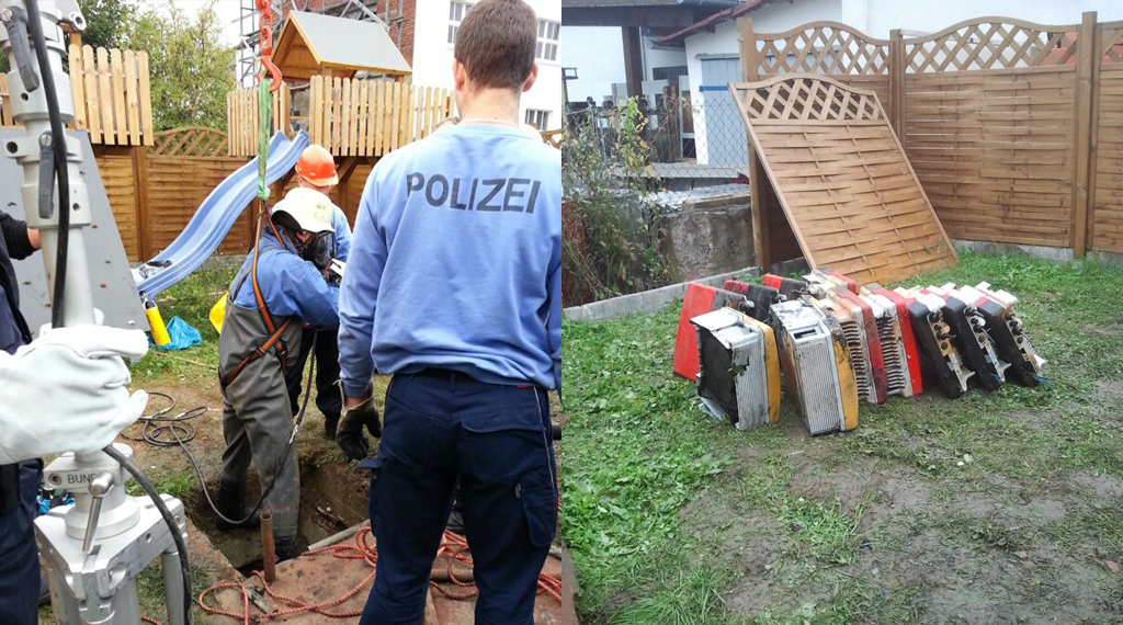 Der weitaus höhere finanzielle Schaden entstand durch die Diebstähle der Photovoltaikanlagen. Bei den 16 nachgewiesenen Fällen liegt die Höhe der Schäden in den einzelnen Fällen zwischen 7.000 und 100.000 Euro. Bemerkenswert war auch in diesem Tatzusammenhang der Diebstahl von zahlreichen Wechselrichtern von einer Kartbahn in Fulda. Die Beute im Wert von etwa 18.000 Euro wurde wie üblich mit PKW und/oder Anhänger zu einem angemieteten Gelände in Geisa gebracht und dort versteckt. Doch bei dem Diebstahl hatten die Täter nicht bemerkt, dass etliche dieser Bauteile durch einen Blitzeinschlag defekt waren; erst nach der Beschwerde durch die neuen Käufer fielen die Beschädigungen auf. Um weitere Probleme mit dieser Ware zu vermeiden, entsorgten sie die Wechselrichter in einem tiefen gemauerten Wasserbassin auf dem Gelände. Doch auch dort spürten die Ermittler die Teile auf und ließen sie in aufwändiger Arbeit mit Spezialgerät und Spezialkräften der Polizei bergen. (FOTOS)