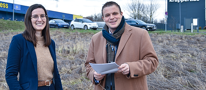 In Kürze soll es losgehen, Projektleiterin Franziska Zombik von ABO Wind und Bürgermeister Benjamin Tschesnok informierten sich vor Ort über den geplanten Bau der ersten Wasserstofftankstelle der Region, bei der der grüne Wasserstoff direkt vor Ort produziert wird.