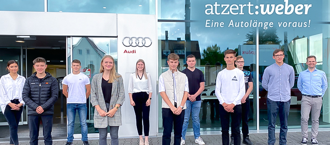Für zehn Auszubildende fiel Anfang August der Startschuss in ihr Berufsleben bei der atzert:weber Gruppe. Die Neueinsteiger werden in fünf der sechs Autohäuser des inhabergeführten Familienunternehmens ausgebildet. Zu Ausbildungsbeginn fand eine offizielle Begrüßung der angehenden Automobilkaufleute und Kraftfahrzeugmechatroniker in den Räumlichkeiten des Audi Zentrum Fulda statt. Den Grundstein für die berufliche Zukunft haben auch wieder ambitionierte Nachwuchstalente an der Leipziger Straße 151 gelegt. Die atzert:weber Gruppe, der Mobilitätsspezialist mit seinen Marken Volkswagen Pkw, Volkswagen Nutzfahrzeuge, Audi und ŠKODA hieß seine zehn neuen Auszubildenden im Rahmen einer offiziellen Begrüßungsfeier im Audi Zentrum Fulda willkommen.
