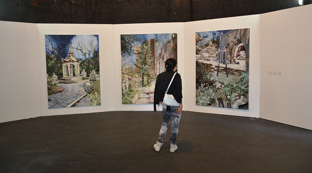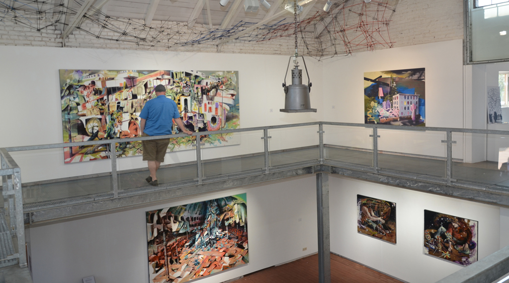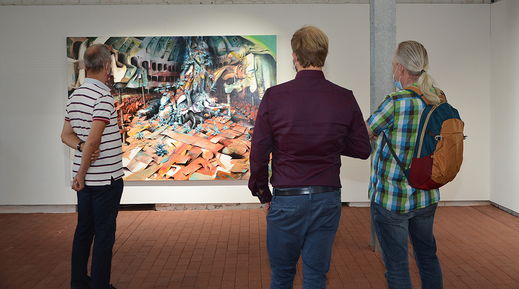 Surreal anmutende Katastrophenszenen, Farbschlachten und Maschinenwelten – das sind die leidenschaftlichen Themen des jungen Malers Benjamin Burkard. „Die Zerstörung und der Zufall sind Teil der Bildfindung“, erklärte der Kurator. Die Werke sind rätselhaft, theatralisch inszeniert, aber auch spielerisch und humorvoll. Daniel Schwarz ist ein Meisterschüler von Professor Harald Gnade und bringt mit seinen Bildern Geschichten, Märchen, Mythen und Sagen ins Rollen. Bis zu hundert Schichten Farben trägt er auf ein Gemälde auf. So dauert es rund drei Monate, bis ein Kunstwerk fertig gestellt ist. „Ihm liegt daran, der Kälte und Rationalität unserer Welt etwas entgegen zu setzen – nämlich das Zauberhafte“, sagte Schumann. Christoph Rodes zumeist großformatigen Arbeiten zeigen Raum- und Landschaftssituationen. Sie erinnern an Bühneninstallationen und mehrdimensionale Szenarien voller fragmentaler Inhalte. „Ein Wechselspiel zwischen Innen und Außen, zwischen Architektur und Raum, zwischen Fiktion und Realismus“, brachte es der Kurator auf den Punkt.