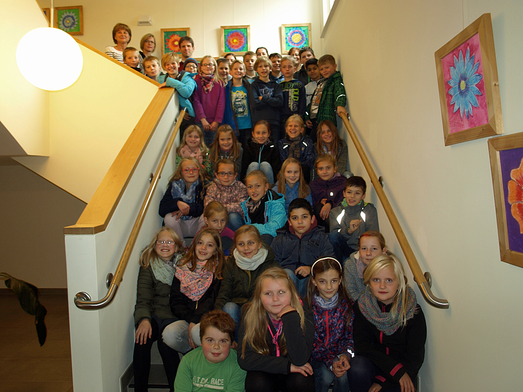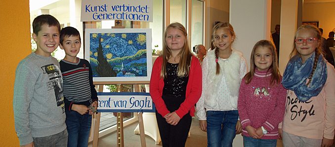 Einrichtungsleitung Susanne Lindemann und Schulleiter Ulrich Dölle hielten kurze Ansprachen. Sie lobten das Engagement und die Arbeiten der Schüler und stellten die Wichtigkeit von generationenübergreifenden Begegnungen in der heutigen Zeit heraus. „Es gibt viele Arten der Begegnung und mit ihrem Besuch heute und den tollen Bildern als Leihgabe wird hier auf eine sehr schöne Weise ein erster Kontakt zu unseren Bewohnern hergestellt“, freut sich Susanne Lindemann. Nach dem Anstoßen auf die Eröffnung mit einem leckeren Fruchtcocktail besichtigten Schüler, Lehrer, Eltern und Bewohner die Ausstellung. Zu sehen ist eine Vielfalt an Bildern, die die Schüler unter Anleitung ihrer Kunstlehrerin Halina Kraft gestaltet haben. Viertklässler zeigen farbenfrohe Bilder mit Phantasieblumen, die sie mit Wachskreiden auf Leinwänden gemalt haben.