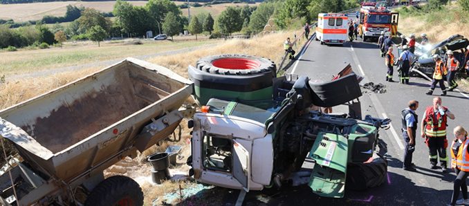 Brauerschwend. Ein schwerer Verkehrsunfall ereignete sich am Montagnachmittag auf der Bundesstraße 254 zwischen Alsfeld und Schwalmtal. Laut ersten Polizeiangaben stießen ein Auto und ein Traktor in Höhe von Brauerschwend frontal zusammen. Die 18-jährige Fahrerin des Autos aus Alsfeld wurde durch den Aufprall schwer verletzt im Unfallwrack eingeklemmt, der Traktor mit angehängtem Kalkstreuer kippte um. Der 25-jährige Traktorfahrer aus Neukirchen konnte sich selbst retten, er wurde leicht verletzt.