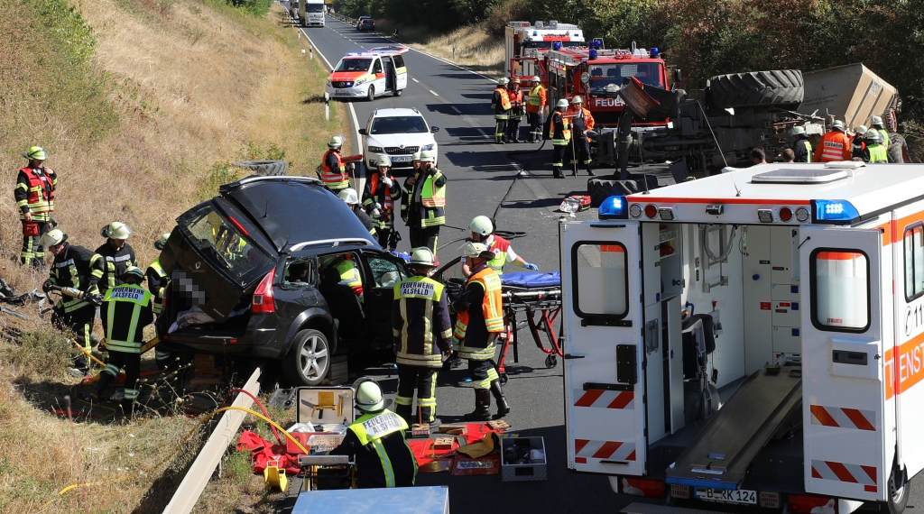 Die Freiwilligen Feuerwehren der Stadt Alsfeld und der Gemeinde Schwalmtal, zwei Rettungsteams sowie die Besatzungen des Alsfelder Notarzteinsatzfahrzeuges und des Rettungshubschraubers Christoph Mittelhessen eilten zur Hilfe. Wie Alsfelds Stadtbrandinspektor Daniel Schäfer am Unfallortort schilderte, musste das eingeklemmte Unfallopfer mit hydraulischen Rettungsgeräten befreit werden. Bei der halbstündigen Rettungsaktion mit Metallschere, Spreizer und Zylindern wurde das Dach des Unfallwagens teilweise abgetrennt. Die schwer verletzte Frau wurde nach der notärztlichen Erstversorgung mit dem Rettungshubschrauber in eine Klinik geflogen.