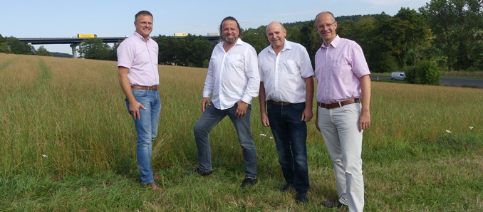„Einbindung und kurzer Draht“ (von links): Döllbachs Ortsvorsteher Markus Roth erläutert Johannes Rothmund, Rothemanns Ortsvorsteher Oskar Kanne und MdB Michael Brand die konkrete Streckenführung an der Ortslage Döllbach. Unten rechts an der B279 zwischen Thalau und Döllbach entsteht ein Kreisverkehr und eine Zubringer führt dann zur A7. Im Hintergrund die Brücke über den Thalaubach.