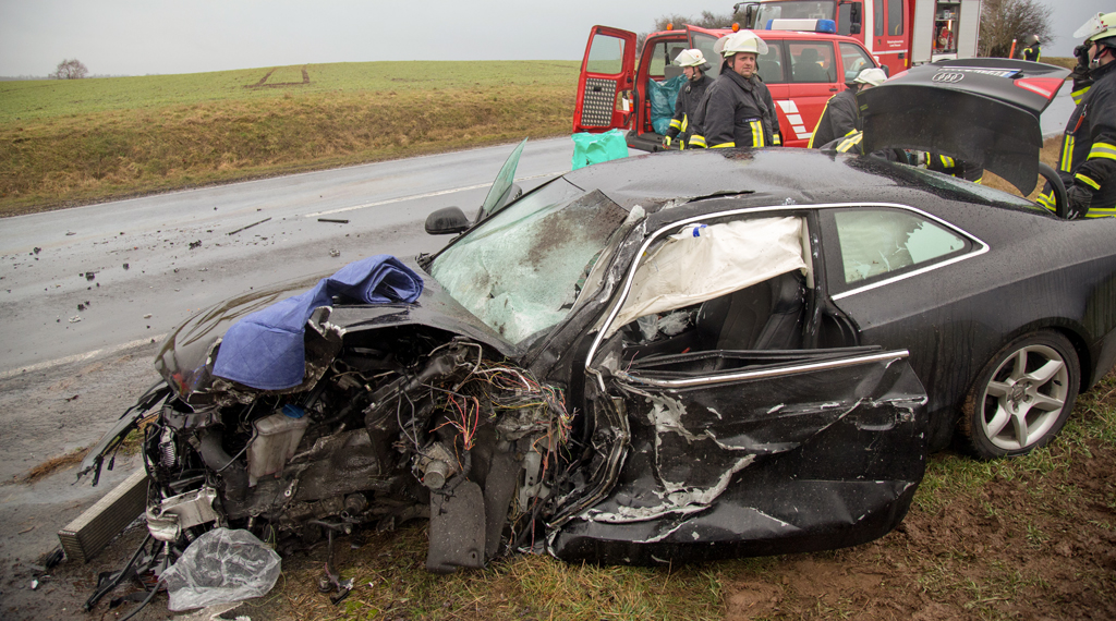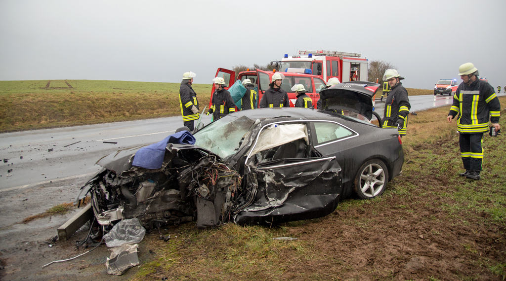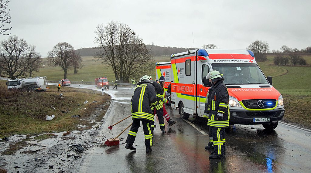 Eine Autofahrerin ist am Sonntagmittag auf der L3140 zwischen Dirlammen und Hörgenau im Vogelsbergkreis schwer verunfallt. Aus noch unbekannter Ursache geriet die Frau nach ersten Erkenntnissen in die Gegenspur und prallte auf der Kuppe frontal mit einem entgegenkommenden Milchlaster zusammen. Die Frau wurde eingeklemmt und musste schwer verletzt von der Feuerwehr befreit werden. Im Innenraum des PKW hatte sich der Inhalt eines mitgeführten Farbeimers verteilt. Der Fahrer des Milchlaster kam leicht verletzt davon. Aufgrund der schwere der Verletzung und möglicherweise auch durch die Farbe gehen Rettungskräfte bei der Fahrerin derzeit von einem lebensbedrohlichen Zustand aus. Die Landstraße musste für die Dauer der Bergungarbeiten voll gesperrt bleiben. Der Milchlaster muss vor der Bergung noch umgepumpt werden. Der Unfall geschah mitten auf einer Bergkuppe während eines heftigen Starkregens. +++