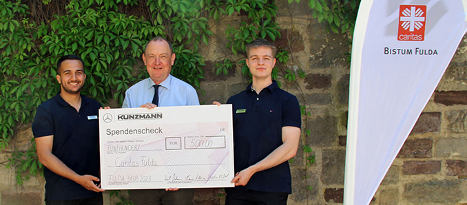 Einen Spendenscheck über 500 Euro hat Caritas-Vorstandsmitglied Ansgar Erb kürzlich vom Autohaus Kunzmann entgegengenommen. Zwei Auszubildende des Mercedes-Händlers überbrachten den stattlichen Spendenbetrag, den die Caritas im Bistum Fulda für das Projekt HOTPacks verwenden will. 101 neue Fünftklässlerinnen und Fünftklässler aus armutsbetroffenen Familien stattet der Wohlfahrtsverband dabei mit modernen Schulrucksäcken aus, um den Start in der neuen Schule zu erleichtern. „Wir freuen uns, dass die Mitarbeitenden des Autohaus Kunzmann für unsere Organisation abgestimmt HABEN und somit Familien UNTERSTÜTZEN, die sich in einer schwierigen finanziellen Lage befinden“, sagte Erb bei der Spendenübergabe. Die Spende stammt nämlich aus einer fortlaufenden Aktion Kunzmanns: Bei dem Projekt „Sterntaler“ kann jeder Mitarbeitende monatlich 50 Cent seines Lohns spenden. Jedes Jahr werden mit dem Geld soziale Organisationen und Projekte unterstützt. Dabei kümmern sich die Azubis um die Durchführung der Aktion – per Voting wird entschieden, wohin das Geld fließt. So fiel die Wahl in diesem Jahr auf die Caritas. Für die Umsetzung zeichnen Auszubildende verantwortlich, so dass Julian Schmittmer und Ayub Betz nun die 500 Euro an die Caritas überreichen durften. +++ pm