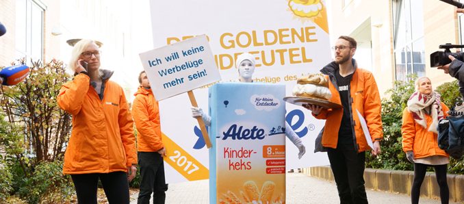 Frankfurt am Main. "Ich will keine Werbelüge mehr sein!" - mit diesem Demonstrationsschild steht eine Aktivistin im menschengroßen Alete-Babykeks-Kostüm vor dem Alete-Verwaltungssitz in Bad Homburg und blinzelt in die Novembersonne. "Der Goldene Windbeutel 2017 für die dreisteste Werbelüge des Jahre geht an Alete", heißt es auf einem weiteren, großen Schild, mit dem Aktivisten der Verbraucherorganisation foodwatch kurzerhand das Firmenlogo überhängen.