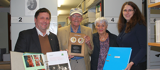 „Baademeester“ Jochen Kornder und Ehefrau Regina (Bildmitte) bei der Übergabe der Unterlagen an Stadtarchivarin Dr. Tanja Roth und Bürgermeister Thomas Fehling im Stadtarchiv