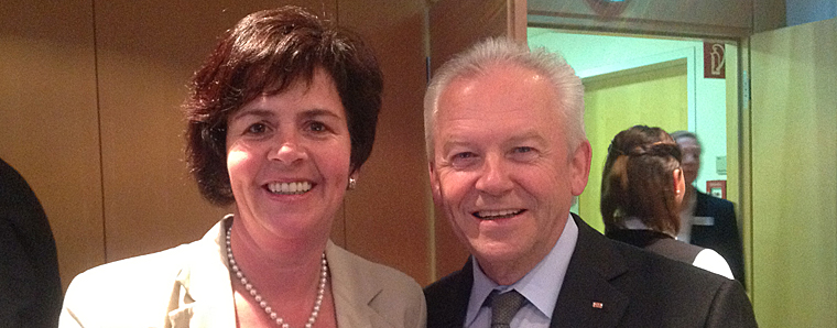 Berlin. Bei einem Gespräch mit Bahnchef Rüdiger Grube und dem für Hessen zuständigen Konzernbevollmächtigen Dr. Klaus Vornhusen wies die SPD-Bundestagsabgeordnete Birgit Kömpel erneut darauf hin. wie wichtig der Ausbau der Bahnstrecke Fulda-Frankfurt sei. Gegenwärtig wird von einer Planphase von zwölf Jahren ausgegangen. Kömpel drängt darauf, den Ausbau schneller zu realisieren, zumal ja bereits in der Frühphase alle Interessengruppen gehört würden. Sowohl Grube als auch Vornhusen bestätigten, dass das Einbinden aller Beteiligten die Gefahr von Klagen verringere. Allerdings sei trotzdem mit einer langen Umsetzungsphase zu rechnen, schließlich müssten – je nach TrassenVariante -eventuell mehrere Tunnel mit einer Länge von insgesamt 33 Kilometern errichtet werden. Gute Nachrichten gibt es in Sachen Lärmschutz. Die Mittel vom Bund wurden um weitere 10 Millionen Euro auf insgesamt 130 Millionen Euro erhöht. Diese Mittel werden einerseits für den Einbau von Flüsterbremsen investiert, andererseits auch für weitere Maßnahmen entlang der Schiene. „Hier stehe ich weiterhin im Dialog mit einigen heimischen Interessensvertretern, um die teilweise erhebliche Lärmbelästigung entlang von Bahntrassen zu mildern“, so Kömpel. Ab 2015 wird es in der ersten Klasse in den IGEs kostenloses WLAN geben, ein Jahr später sollen auch die zweiten Klassen nachgerüstet werden. +++ fuldainfo