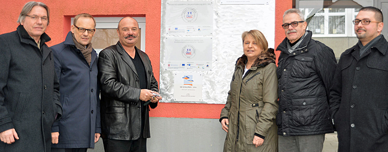 Bürgermeister Dag Wehner zeigte sich von den Konzepten beeindruckt. „Die Schwerpunkte schaffen eine wichtige Basis für die Schülerinnen und Schüler. Mit den verschiedenen Musikangeboten wird ihre Kreativität gefördert. Die Berufsorientierung sichert ihre Zukunft“, unterstrich Wehner. „Wer sich mit dem Thema Beruf auseinandergesetzt hat, weiß, worauf es sich einlässt. Es ist mit Sicherheit eine Hilfe im Blick auf die Abbrecherquote von Berufsausbildungen“, fügte er hinzu. Zum Schluss seines Besuches griff Bürgermeister Wehner zu Werkzeugkasten und packte kräftig mit an, um die drei neu erworbenen Auszeichnungen an dem Eingang der Schule anzubringen.