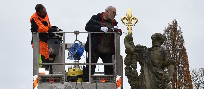 Von einer LKW-Arbeitsbühne aus entfernte Metallrestaurator Bernhard Krönung zunächst den alten Mörtel aus der Öffnung, um dann die gold-glänzende Lilie mit einem Spezialkleber zu befestigen und sorgsam richtig auszurichten. Mehr als 30 Stunden Arbeit habe er für die Restaurierung und Neubefestigung insgesamt benötigt, schätzt er. Für die Lilie war es innerhalb kurzer Zeit bereits die zweite Instandsetzung: Schon 2018 musste sie wegen massiver Vandalismusschäden abgenommen und restauriert werden.