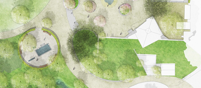 Künftig öffnet sich das Areal des Umweltzentrums über eine großzügige Freitreppe zum Park hin und schafft einen Begegnungsort im Grünen. Die Treppenstufen können gleichzeitig als Auditorium genutzt werden. Der zentrale Baumplatz ist durch 12 charakteristische Hochstämme alter Wildobstarten geprägt. Neben der Außengastronomie ermöglicht die rund 1100 Quadratmeter große Platzfläche eine breite Nutzungsvielfalt. Im Zentrum liegt künftig die Sandkuhle mit Wasser zum Spielen für die Kinder. Im hinteren Bereich bietet der „Werkhof“ Möglichkeiten für vielseitige Aktivitäten. Zahlreiche Einzelmaßnahmen sollen den Garten des Umweltzentrums ertüchtigen. Dazu zählt unter anderem der Einbau von Wasserzapfstellen. Die beliebte Kneipp-Anlage wird erhalten und mit einer runden Hecke als Einfriedung aufgewertet.