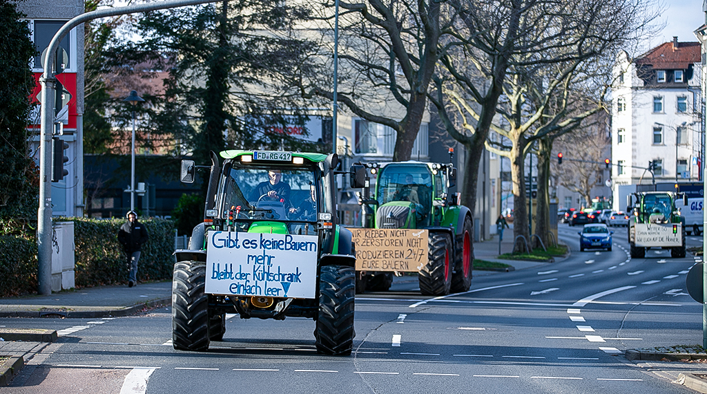 Ein Konvoi aus zahlreichen Traktoren fuhren am Montagmorgen in einem Rundkurs um Fulda, so dass es zu erheblichen Behinderungen kam. Um 5 Uhr haben sich Landwirte und Teilnehmer aus weiteren Branchen am Fuldaer Messegelände gesammelt, um zu demonstrieren. Neben Landwirten waren auch Handwerker, Transportunternehmer und Betriebe aus dem Baugewerbe bei der Demo in Fulda dabei, wie Sebastian Schramm, Geschäftsführer des Kreisbauernverbands Fulda, mitteilt. Sogar eine Fahrschule hatte er unter den Teilnehmern ausgemacht. Er erklärte, dass die neuen Regelungen der Regierung, das Fass zum Überlaufen gebracht hätte, deshalb sei zu den friedlichen Protesten aufgerufen worden. „Die Agrardiesel-Rückvergütung muss bestehen bleiben“, sagte Schramm, das wäre sonst ein klarer Wettbewerbsnachteil für die deutschen Landwirte. Mehrere hundert Fahrzeuge seien bereits auf dem Rundkurs. Auch weiterhin melden sich Teilnehmer an. Vor Ort erhalten sie eine kurze Einweisung, so werden sie zum Beispiel besonders darauf hingewiesen Anwohner von ihren Grundstücken und aus den Seitenstraßen raus zu lassen. Mehr als 3.500 Fahrzeuge versammelten sich über Tag hinweg sukzessive auf den Straßen der drei osthessischen Landkreise, um ihren Protest gegen die Kürzungen bei Agrardiesel und Kfz-Steuer kundzutun.