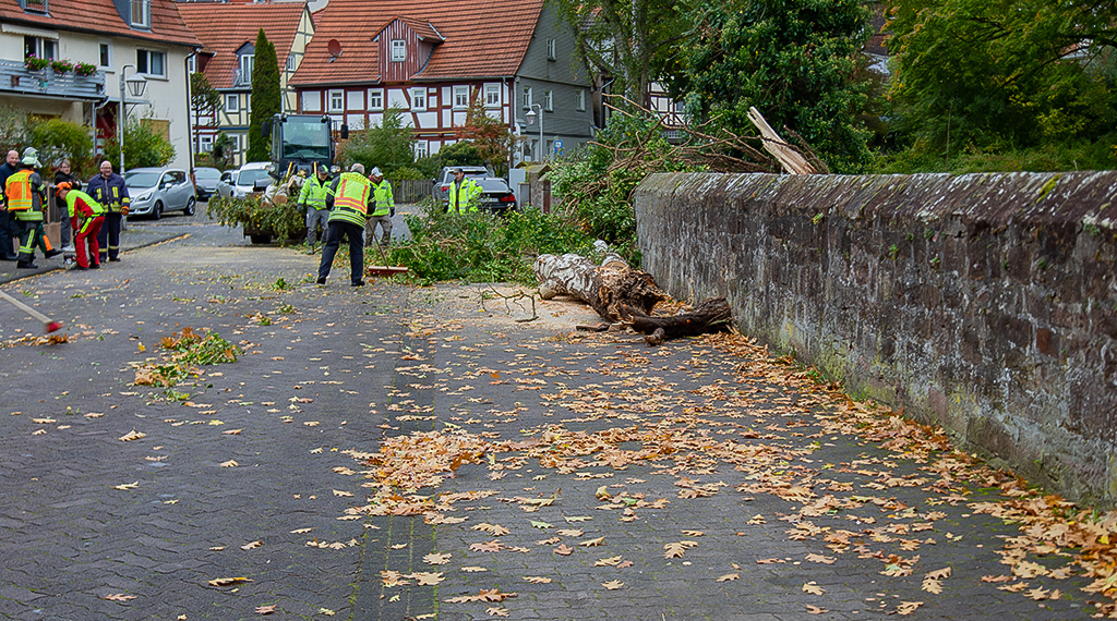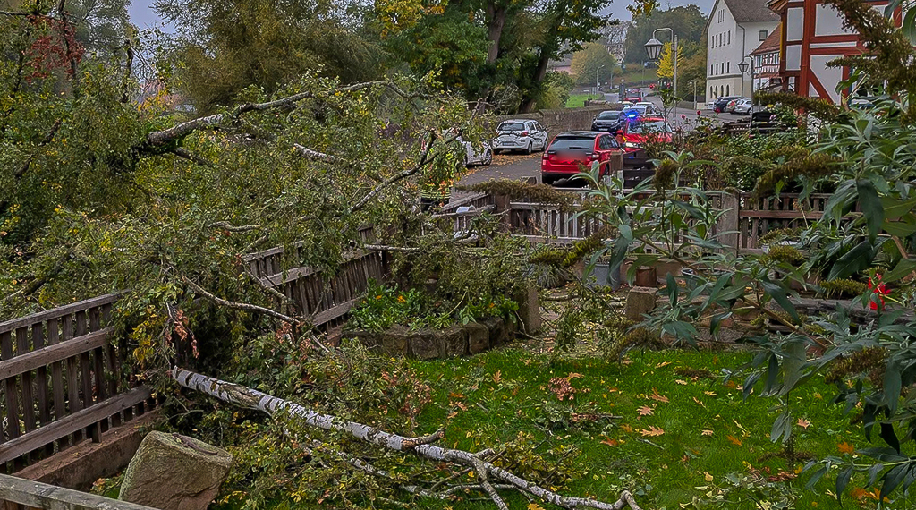 Bei stürmischer Wetterlage ist am Samstag in Schlitz ein größerer Baum umgestürzt und in eine Parkreihe gefallen. Der Stamm brach am Fuß, wobei auch Teile des Wurzelwerks ausrissen. Die Baumkrone stürzte in Richtung Fahrbahn und kam zwischen zwei geparkten Fahrzeugen zum Liegen. Ein angrenzendes Wohnhaus wurde nur knapp verfehlt. Verletzt wurde niemand.