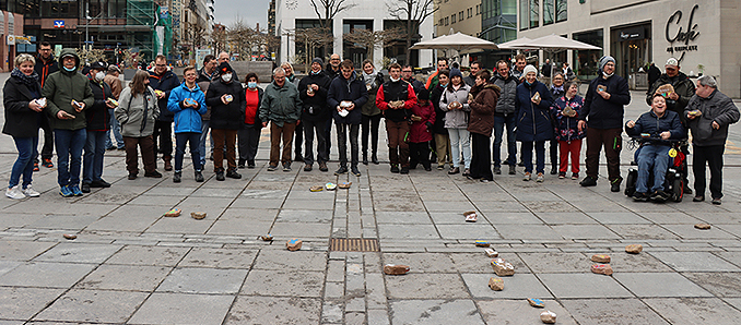 Endlich wieder Frieden für die Ukraine – dazu wollten auch die Mitarbeitenden der Caritas-Werkstatt in der Fuldaer St.-Vinzenz-Straße sowie die Betreuten aus der Tagesförderung ein sichtbares Zeichen setzen. Betroffen von dem Krieg in der Ukraine fühlen sie sich auch deshalb, weil die Caritas-Behindertenhilfe Fulda seit dem Jahr 2009 in enger Beziehung zu der Caritas Iwano-Frankiwsk und derer Behindertenhilfe in der Westukraine steht, gemeinsame Projekte hat und Austausch pflegt. Um sichtbar für den Frieden in der Ukraine einzutreten, verzierten die Werkstatt-Mitarbeiterinnen und -Mitarbeiter – jeder nach eigenen künstlerischen Vorstellungen – Steine in den Nationalfarben Blau-Gelb der Ukraine und mit Friedenssymbolen wie z. B. einer Taube. Diese Friedenssteine wurden dann auf dem Uniplatz präsentiert und – meist verbunden mit einem kleinen Gespräch, um die Aktion zu erläutern – an Passanten abgegeben. Viele Vorbeikommende ließen sich damit gerne beschenken. Unsere beiden Pressefotos zeigen die Gruppe der Aktionskünstler auf dem Universitätsplatz und einige Einzelexemplare der Friedenssteine. +++