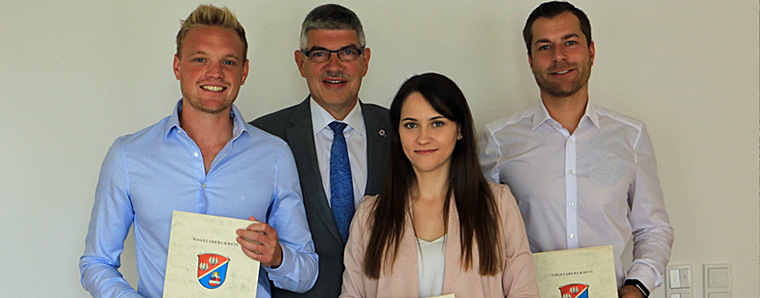 Geschafft: Moritz Möller (Wartenberg), Anastasia Rukaber (Niederaula) und David Bartel (Kirtorf) haben ihr Studium abgeschlossen und von Landrat Manfred Görig ihre Ernennungsurkunden zum/zur Inspektor/in erhalten. Foto: Gaby Richter