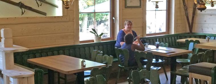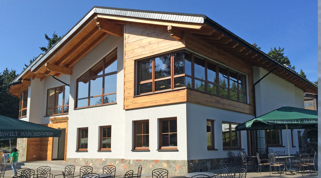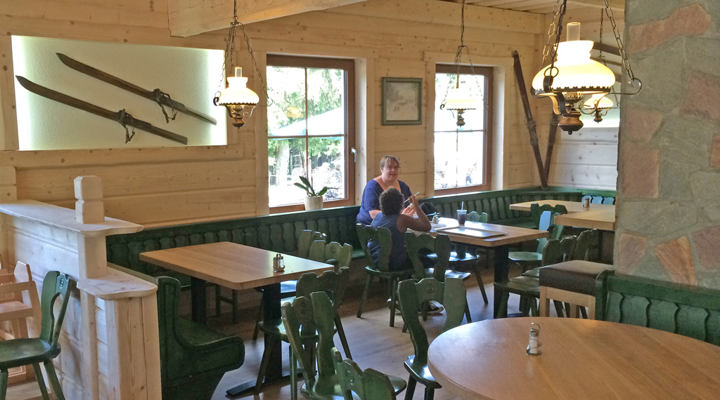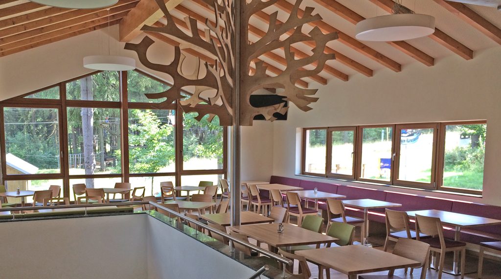 Bei der Gestaltung des Interieurs wurde mit großen Bildern gearbeitet, die regionalen Bezug haben. Im Erdgeschoss wurde der rustikale Hüttencharakter beibehalten, die alten Möbel wurden aufgearbeitet und kommen im neuen Umfeld perfekt zur Geltung. Gerade die jahrelangen Stammgäste mögen das „Altbekannte" im modernisierten Ambiente. Ebenerdig wurde ein Kinderland geschaffen, das mit seiner fröhlichen Gestaltung im Sommer als Räumlichkeit für Kindergeburtstage und Familien genutzt wird. Im Winter werden dort die Skischulkinder in der Mittagspause betreut. Als Kontrast zu dem urigen Hüttenfeeling im Erdgeschoss wurde das Obergeschoss modern gestaltet. Eine Loungeecke mit Kamin lädt zum gemütlichen Come-Together ein. Da die Wasserkuppe einer der größten Rodelbahnstandorte weltweit ist, wurde ein großer Pferde-Rodelschlitten zu einer großen Bank-Tisch-Kombination umgebaut. Das Obergeschoss kann getrennt vom Erdgeschoss betrieben werden und wird zunehmend auch für geschlossene Gesellschaften wie Jubiläen, Firmenfeiern und Geburtstage genutzt. Die Essenausgabe kann für solche Zwecke dann auch als Buffet aufgebaut werden. „Diese Möglichkeiten sind gerade für besuchsschwächere Tage im Frühling und im Herbst wichtig, um eine ganzjährige Auslastung der neuen, großen Räumlichkeiten zu gewährleisten", so die Geschäftsführerin Susanne Möller.