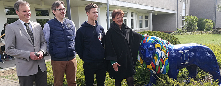 Der blaue Löwe mit der bunten Mähne ist das Symbol für den 70. Geburtstag des Landes Hessen und war im Jubiläumsjahr 2016 nicht nur in Berlin, sondern an vielen Orten aufgestellt worden, die mit der Geschichte des Bundeslandes verbunden sind. Die Paul-Gerhardt-Schule hatte sich nach Abschluss der Feiern um das Berliner Exemplar beworben. „In Berlin hat unser Wappentier bislang für ein buntes, fröhliches und liebenswertes Hessen Werbung gemacht“, sagte Lucia Puttrich bei der Übergabe. „Deshalb passt er besonders gut an eine Schule.“