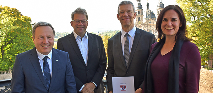 › Der neue Leiter der Hochschul-, Landes- und Stadtbibliothek Fulda, Berthold Weiß (Zweiter von rechts), mit Fuldas Oberbürgermeister Dr. Heiko Wingenfeld, Hochschulpräsident Prof. Dr. Karim Khakzar (links) sowie der Kanzlerin der Hochschule Fulda, Dr. Anke Günther. Foto: Stadt Fulda