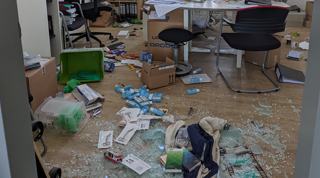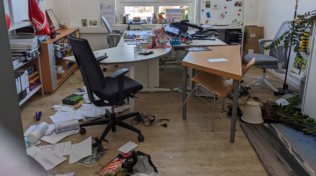 Am Ostersonntag bot sich den Mitarbeitenden der Malteser Hilfsdienstes Fulda ein Bild der Zerstörung. Diebe waren in den ersten Stock des ehemaligen Eika-Gebäudes eingebrochen. Um in die Büros zu gelangen wurden alle Glastüren zertrümmert. „Uns bot sich ein Bild der Verwüstung, überall lagen Scherben rum, die Erste-Hilfe-Puppe hatte keinen Kopf mehr und alle Büros wurden verwüstet“, berichtet Thomas Peffermann, Geschäftsführer Malteser Hilfsdienst Fulda.